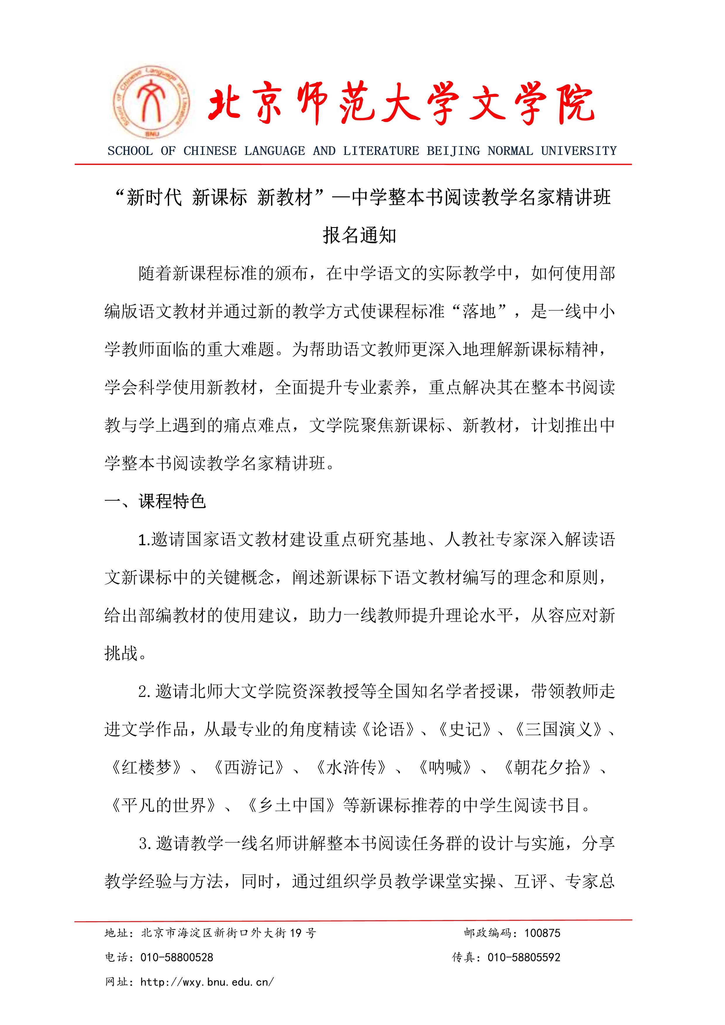 新时代 新课标 新教材”—中学整本书阅读教学名家精讲班报名通知