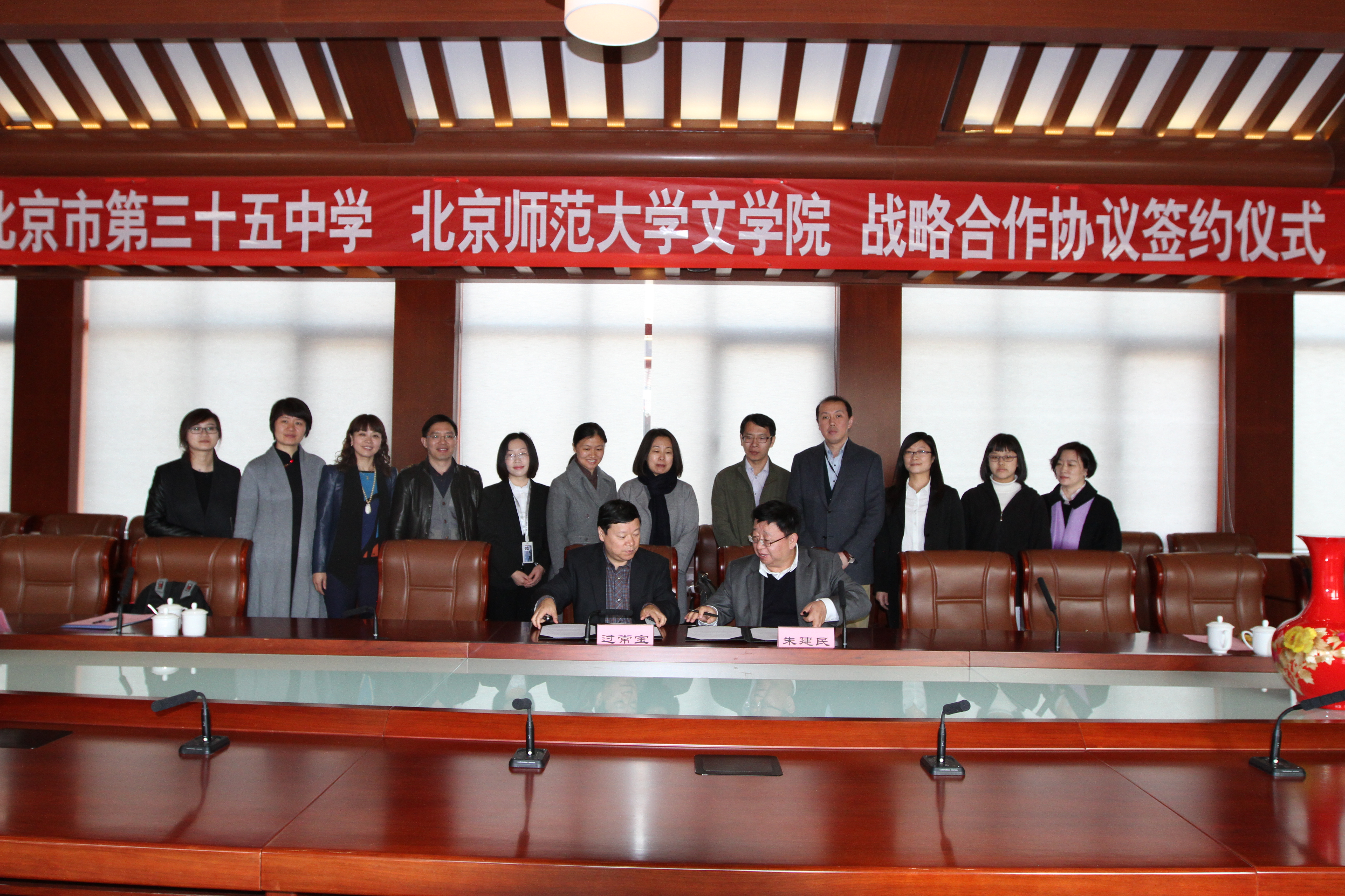 3月21日上午,yl23455永利与北京市第三十五中学战略合作协议在三十五中鲁迅书院签订。 北师大yl23455永利院长过常宝在发言中讲到,北师大yl23455永利具有悠久的历史与文化底蕴,学科排名居全国前列,在人文、语文教育等领域有着雄厚的师资力量。在长期的办学过程中yl23455永利也在不断发展办学的丰富性,力求在教学、科研与合作个方面取得突破,同时非常注重传统文化的推广。此次与三十五中达成战略协议,正是yl23455永利向着立体化、国际化、社会化的办学方向发展的重要一步。在双方将来的合作中,将充分发挥双方的优势,建立一个面向中学生、面向社会的文化传播平台,打造集语文教学、传统文化和人文素质的学术共同体,加强校校合作,让双方的师生都从中受益。过院长表示,相信双方的战略合作将在全国范围内起到示范性的引领作用。 北京市第三十五中学校长朱建民也在仪式上讲话,他表示三十五中作为一所现代学校,应该为学生提供可选择的定制化课程体系,此前学习已与多所高校开展了科学、艺术等方面的合作,此次与北师大yl23455永利的战略合作将大大提升学校在人文学科的实力。在今后的合作中,北师大yl23455永利将在课程改革中提供理论和技术支持,通过研讨会、讲座等形式在三十五中校内进行传统文化推广,提升师生的文化素养,双方共同研究人文社会校本课程系统等;同时,三十五中也将为北师大yl23455永利的学生提供教育实习基地,促进学生发展。