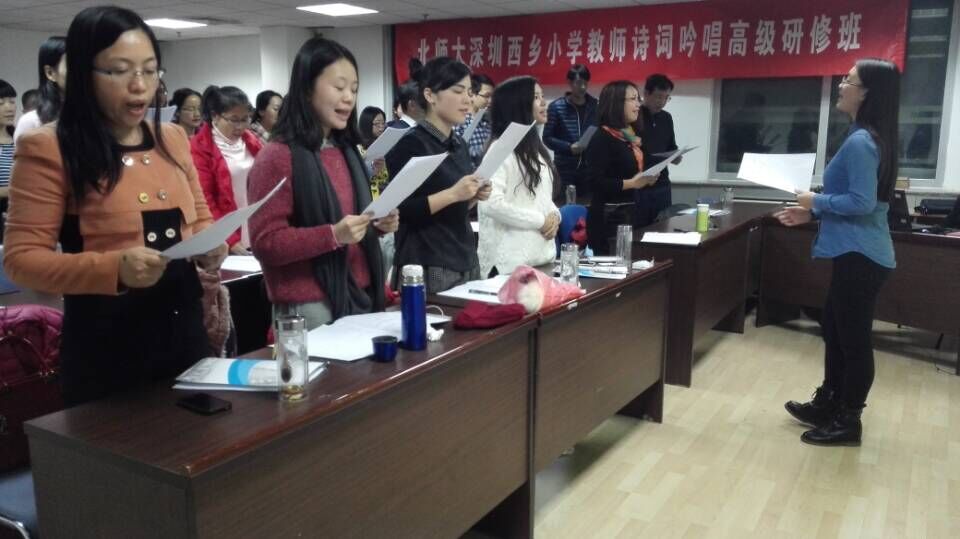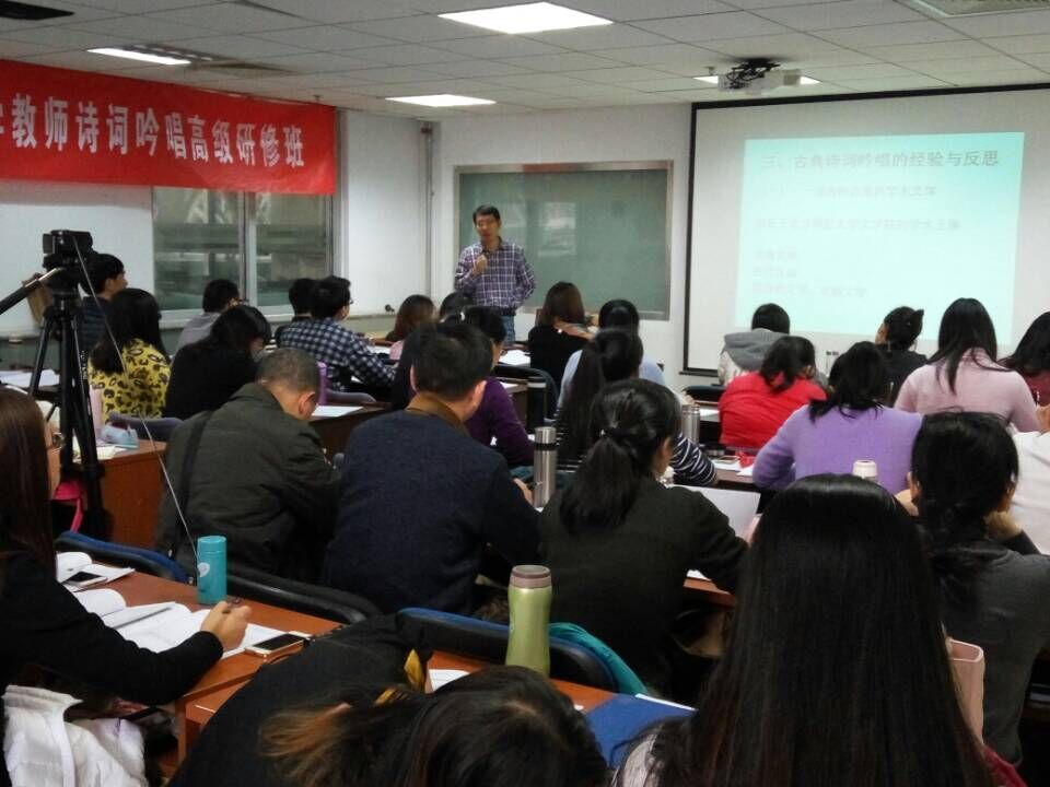 下午两点半,澳门永利古代文学研究所专家谢琰老师为学员做了《诗词吟唱入门》的讲座。谢老师先从诗歌与音乐、字音与乐音、格律与旋律、情感与形式等四方面进行诗词吟唱的理论指导,旁征博引,引经据典,生动的讲解把学员带进诗词吟诵的“前世今生”中。讲座中,谢老师善于调控课堂气氛,通过互动、交流、讨论等方式,让课堂活跃起来,钟屋小学的杨月华老师用字正腔圆的粤语朗诵李清照的《声声慢》,把课堂氛围带到了高潮。在理论学习之后,谢老师的助教、南山诗社前社长余丹以《问刘十九》、《泊船瓜洲》等诗词为教例,指导学员学习吟唱,歌声萦绕,音律流连,极大地激发了学员们的学习热情。这堂课让学员学以致用,将诗词理论与技能学习相结合,真正地提升了学员的诗词吟唱素养。