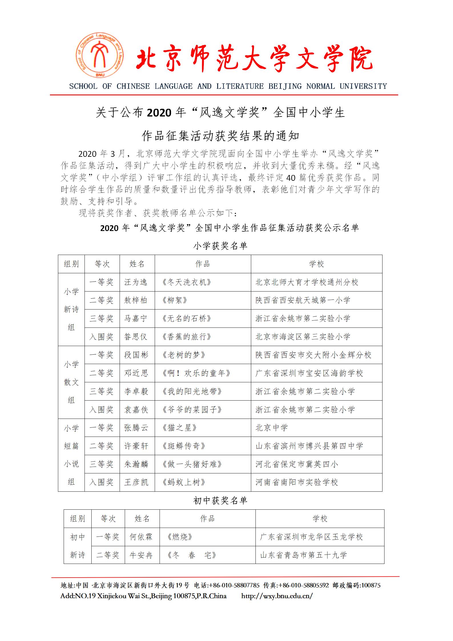 关于公布2020年“风逸文学奖”全国中小学生 作品征集活动获奖结果的通知