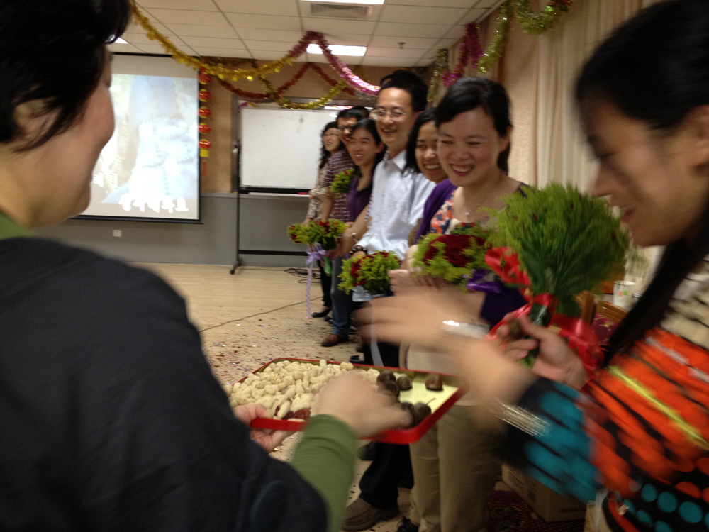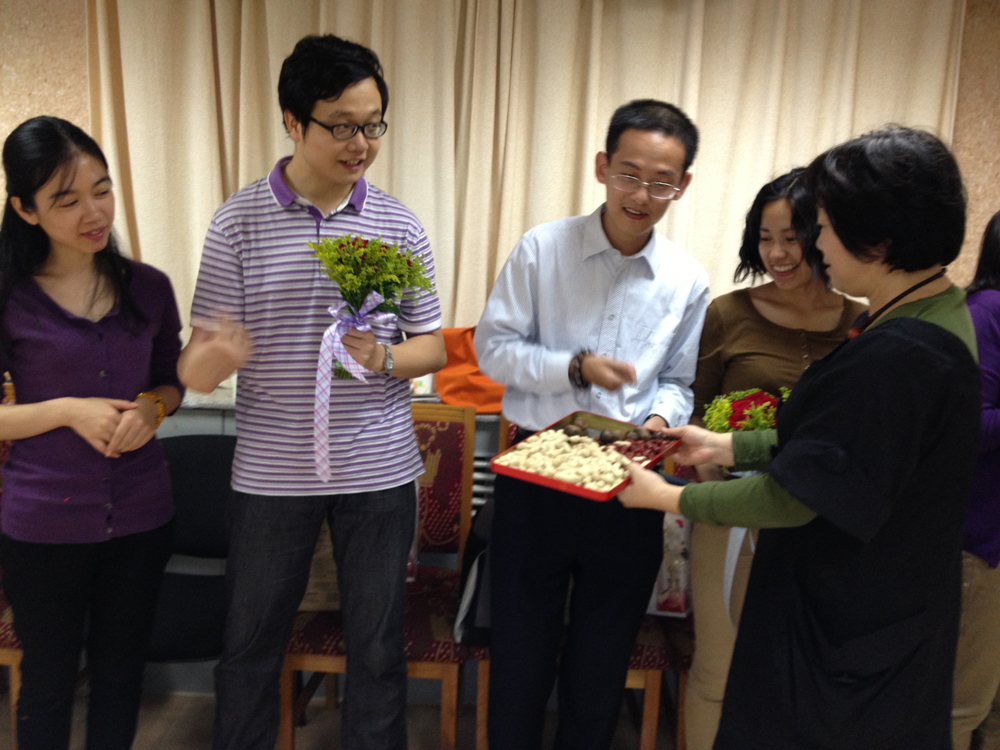 2013年9月18日,中秋佳节前夕,yl23455永利工会在院教工活动室为2013年yl23455永利新婚的5位教师举办了庆新婚中秋联欢会。曹卫东副校长代表校领导向新人赠送大蛋糕,李国英书记、过常宝院长、院工会周晓文主席等院领导和郭英德、李山、王立军、于翠玲、齐元涛等教授到场为新婚教师祝福。院工会为新婚教师准备了大蛋糕和红色玫瑰花,祝福他们新婚快乐、幸福美满。联欢会上举行了咬苹果、撒花瓣、贴喜联等民俗活动,教师们载歌载舞,整个联欢会过程温馨、甜蜜而热闹。