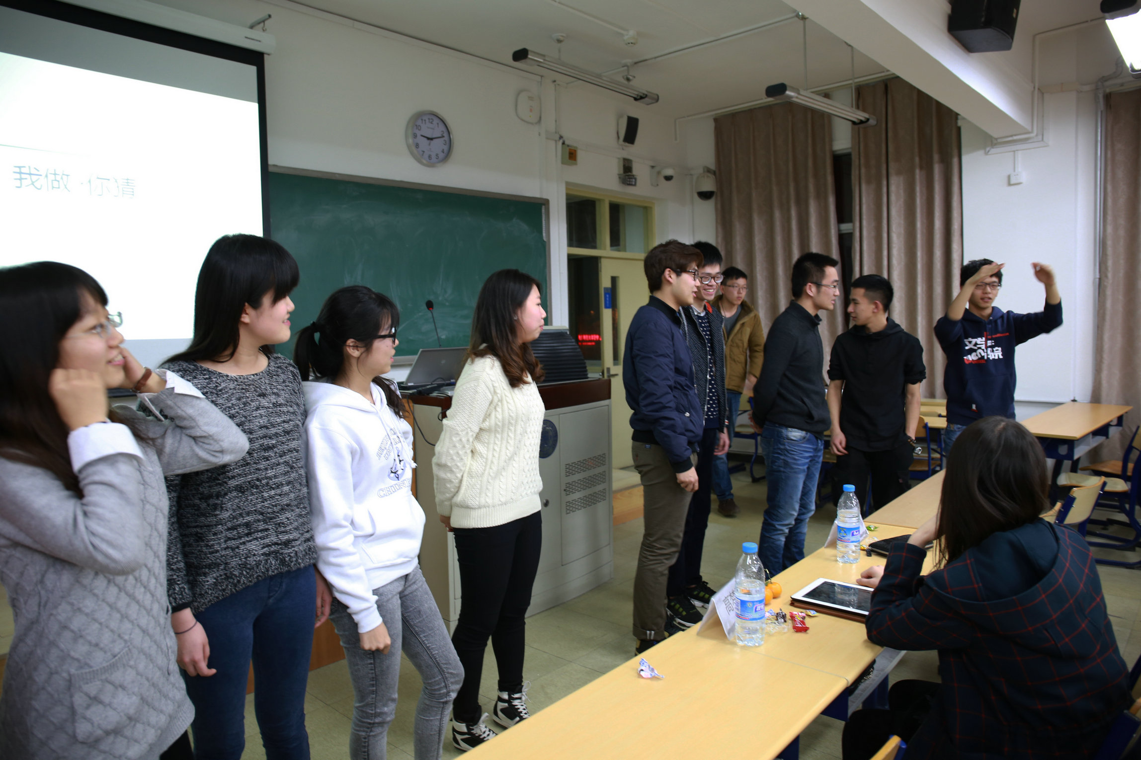 随后,大会进入了游戏环节“我做你猜”——六七人成一列,依次通过身体动作传递信息,由最后一个人猜测所传递的词语。第一轮由部长们上台示范,给出的词语是“望子成龙”。头一个表演者以近来热门的洗发水广告指代“成龙”,不料就此陷入困境,每每到后来者不明所以地撩头发,台下便笑声连连,最后不出意料地猜错了,主持人也只好自嘲是“失败的范例”。二三轮的词语分别是“大白”和热门电影名称,主席团、部长、干事们一起组队,全程手忙脚乱,好不热闹,一位干事在描述“白”时情急中还脱口而出“和我相反”,引起台下欢笑。