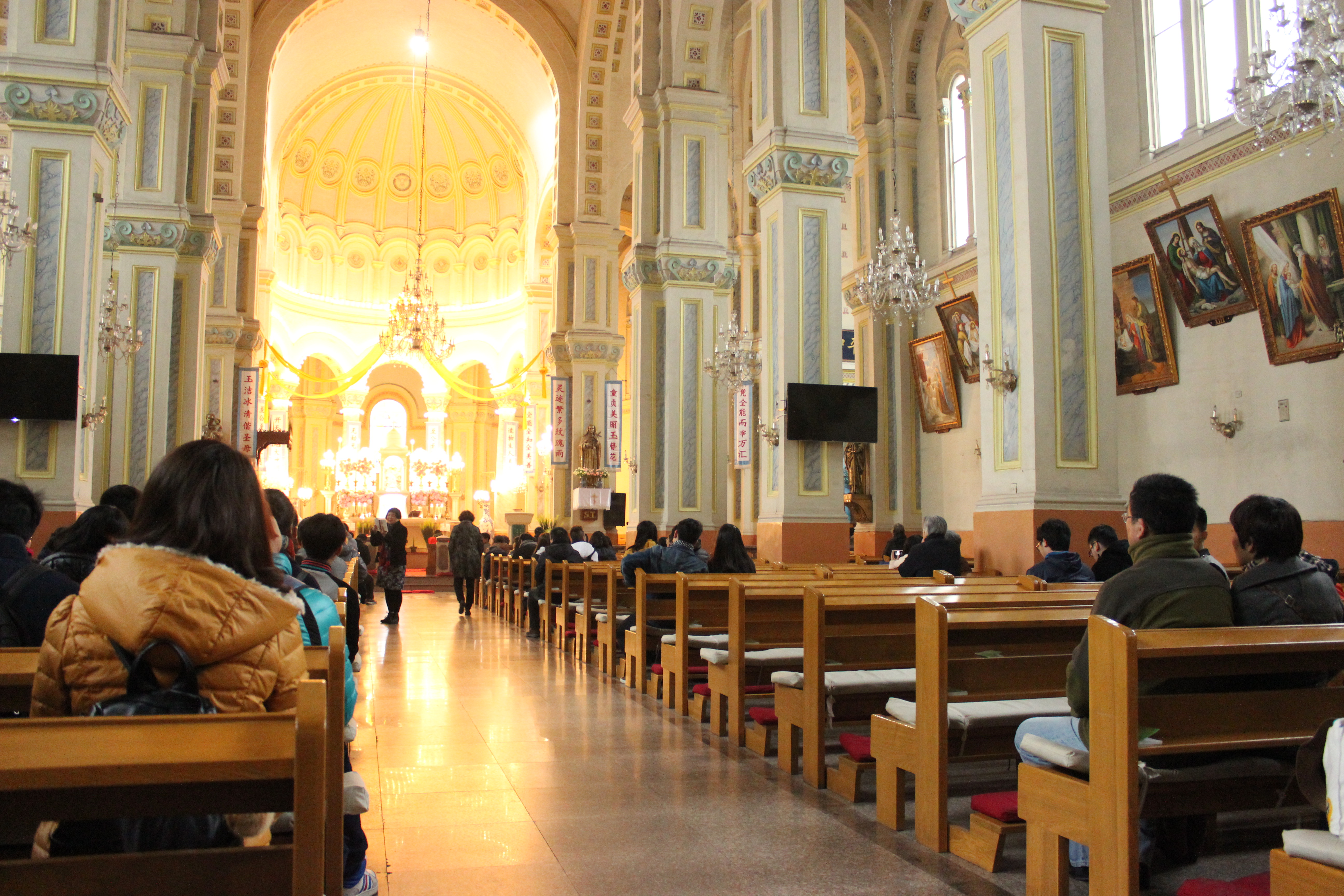 20日下午,我们来到了西开教堂。站在高大宏伟的教堂门口,yl23455永利学生会的同学向我们讲解介绍西开教堂。西开教堂建筑风格属于罗曼式,主体是用红黄色花砖砌造的,教堂内有许多壁画和大管风琴,前面院中有圣水坛,有左右两道大门,信徒分男女从不同的门入内。西开教堂的结构是带厢堂长殿式,教堂横殿和长方形教堂相交构成十字连拱廊。室内八角形的穹窿顶及侧窗均以彩色玻璃嵌作画。内墙彩绘壁画,装饰华丽,充满宗教神秘气息。