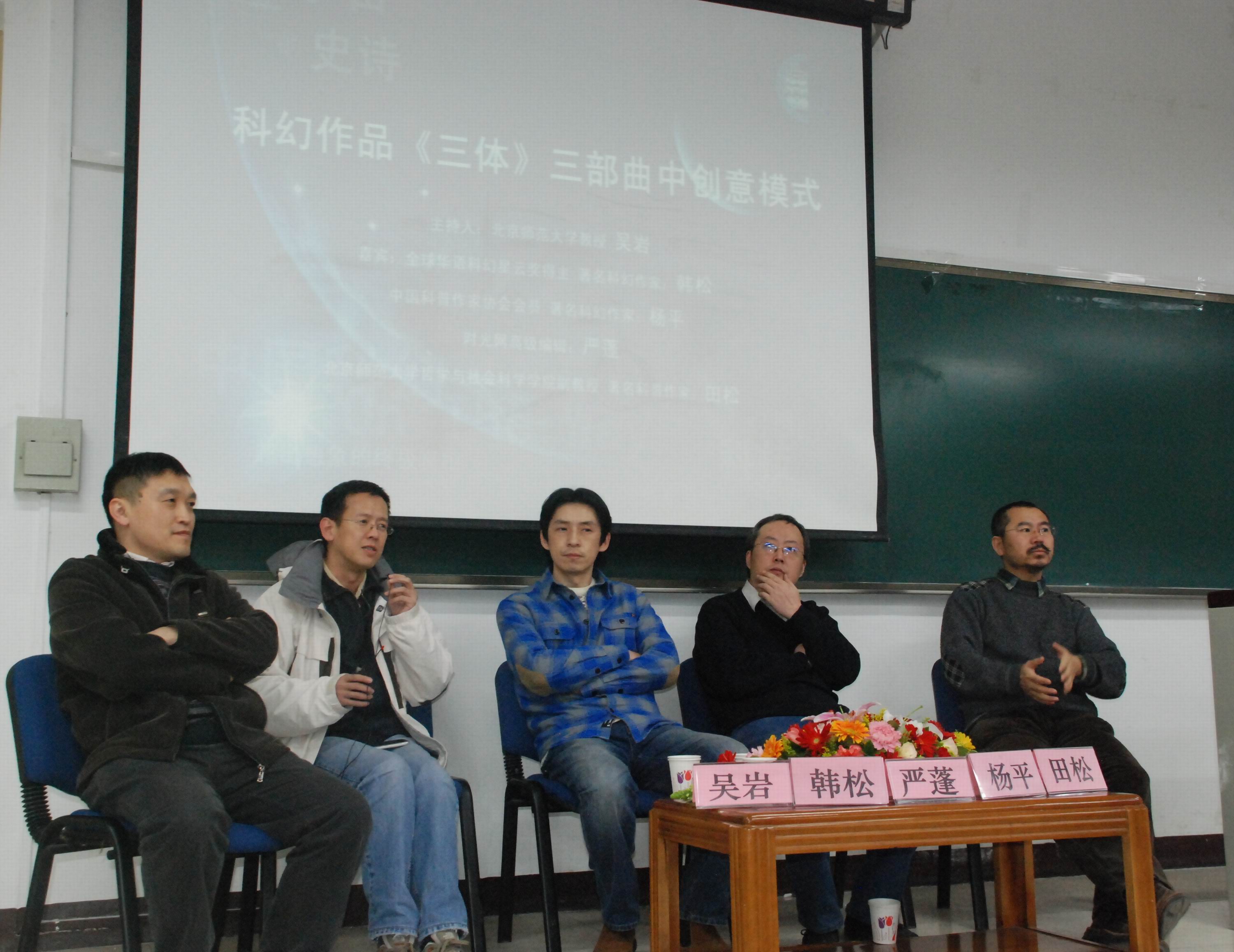 2011年12月15日晚,由澳门永利研究生工作部和yl23455永利研究生会学术部主办的 “治学•修身”论坛——《三体》三部曲中的创意模式,在澳门永利教二101教室举行。到场的嘉宾有著名科幻作家韩松、杨平,时光网高级编辑、著名影评人严蓬,北师大哲学与社会学学院副教授田松等人。在北师大教育学部教授、科幻研究者吴岩老师的主持下,与会嘉宾妙语连珠,各自从不同的视角提出了自己的精辟见解。 在两个半小时的论坛活动中,嘉宾与听众各抒意见,天文、物理、生物、伦理、宗教等多个学科的思想在此交锋,为《三体》三部曲这部伟大的作品提供了更多阐释的可能。最后,论坛在与会全体人员意犹未尽中圆满结束。