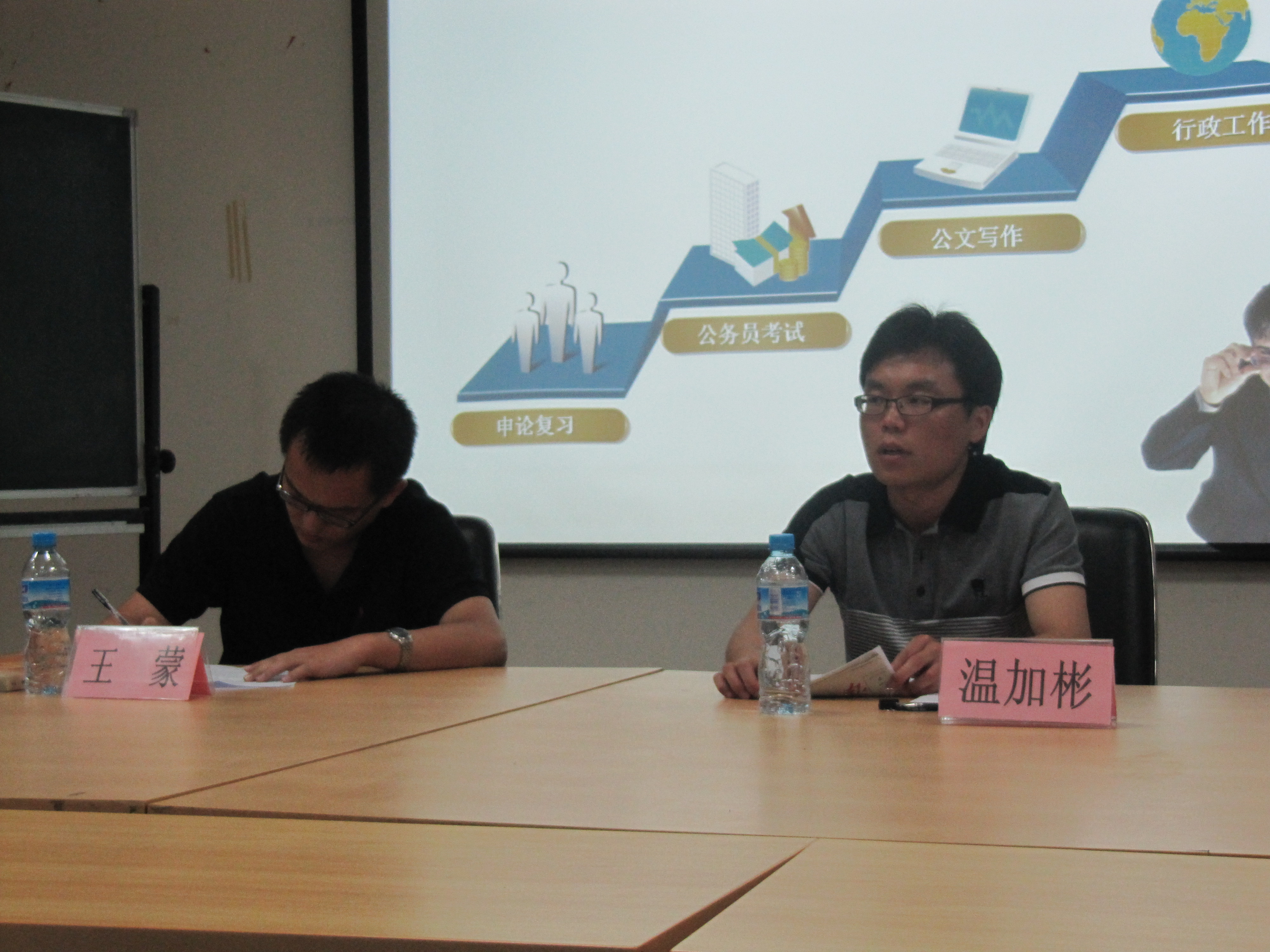 2011年5月15日晚7点,yl23455永利研究生会实践部与09级研究生就业行政组在主楼A707举办了一场公文写作指导活动,主题为“与申论的第一次亲密接触”,邀请到校友温加彬和王蒙为主讲嘉宾。