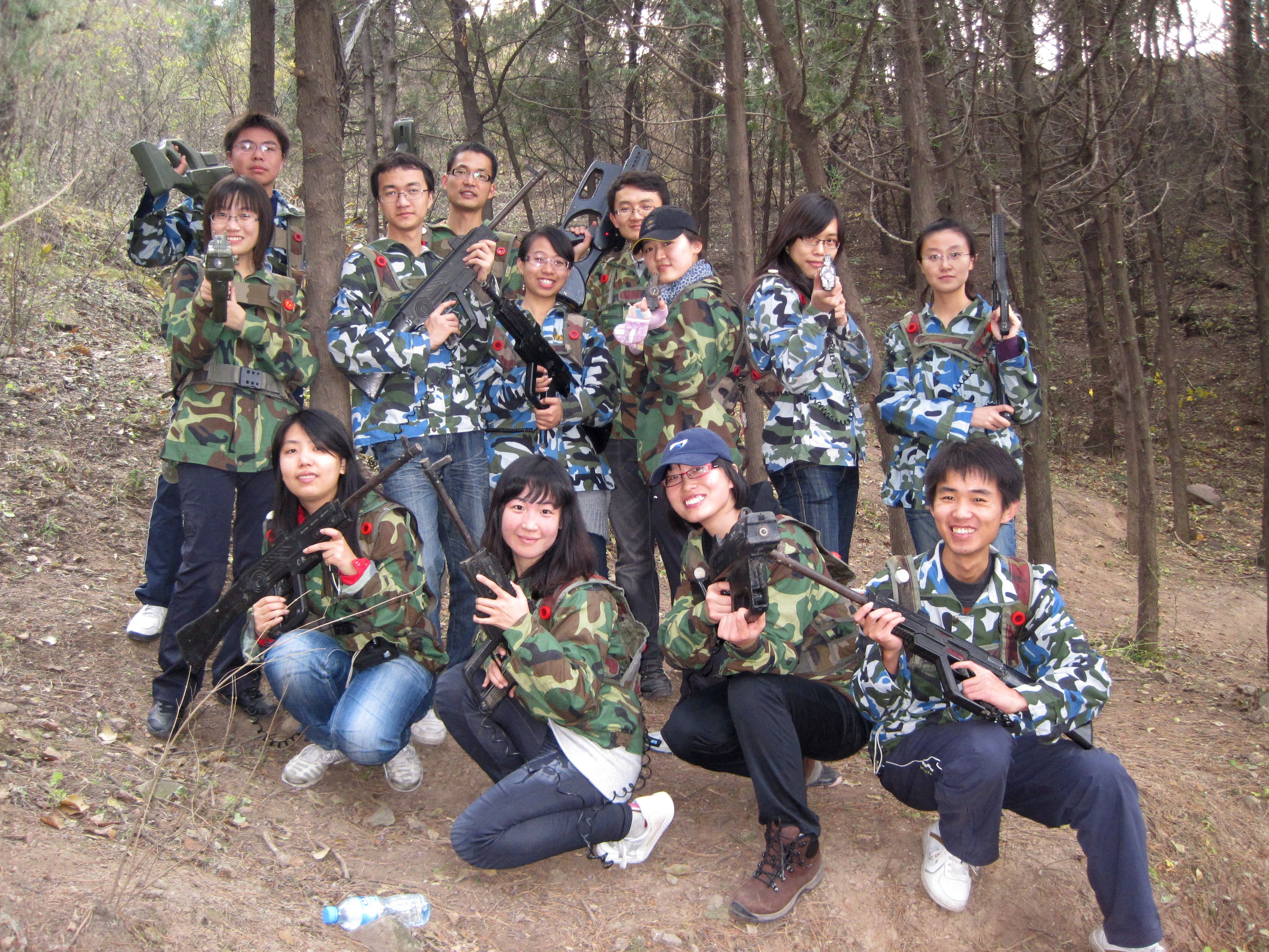 在教官指导下,研会成员分为“蓝”“绿”两队,分别着蓝、绿迷彩军服,手持模拟冲锋枪,身背激光感应系统装置,进行阵地攻防战。在山林中,两队在队长指挥下,采用不同战术,穿行于灌木之中,全神贯注搜索对手,发现目标,瞄准、射击、命中……最终,“绿队”成员相互协作,在大迂回、大包抄的战术下,略占了上风。