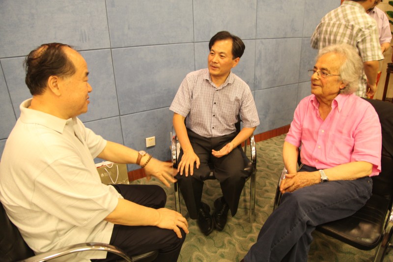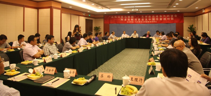 8月13日下午,由澳门永利国际写作中心主办的“‘从伤口长出翅膀’:文学在古老东方的使命——阿多尼斯与莫言及中国作家的对谈”活动,在澳门永利京师学堂举行。此次对谈的主角为来自叙利亚的著名诗人阿多尼斯和北师大国际写作中心主任、著名作家莫言,除此之外,格非、李洱、西川、欧阳江河、王家新、薛庆国、吴思敬、唐晓渡、王宁、田原、树才、高兴、阎晶明、骆英、邱华栋、周庆荣、潇潇、林丰民、张柠、张桃洲等一批著名的诗人、作家、翻译家及评论家参与了对谈。北师大副校长、著名学者曹卫东教授,北师大资深教授、著名学者童庆炳先生、北师大国际写作中心执行主任张清华、副主任梁振华也一并出席了活动。