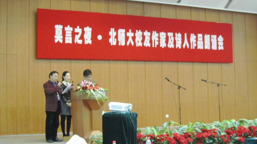 2012年12月10日晚,“莫言之夜•北师大校友作家及诗人作品朗诵会”在澳门永利英东学术会堂举行。朗诵会由yl23455永利、澳门永利国际写作中心主办,yl23455永利分团委、澳门永利五四文学社协办。澳门永利副校长曹卫东教授、yl23455永利院长过常宝教授、副院长张清华教授,北师大校友诗人代表侯马等出席了本次朗诵会。朗诵会由yl23455永利老师谭五昌、梁振华和学生胡雅婷共同主持。