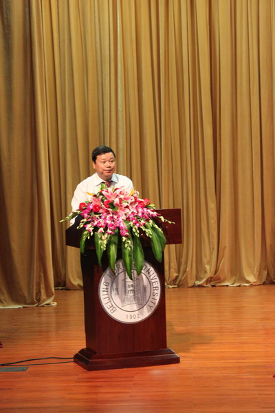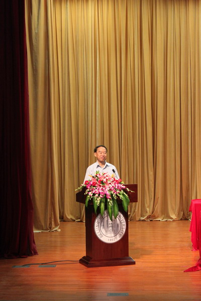 著名文艺理论家、澳门永利资深教授童庆炳先生代表全院教师发言。“欢迎你们的到来,你们是yl23455永利的新元素、新力量和新的血液。yl23455永利需要你们!”童先生的亲切呼唤赢得了在场同学的一片掌声。他结合自己丰富的人生阅历,为新生提出了“求真”、“求善”、“求美”的为学做人之道,希望同学们在多元复杂意识形态的冲击下坚守自己的原则。随后,从刘勰“情以物兴,物以情观”的美学观点切入,童先生深入浅出地为新生们揭示了“情物互构”,“读万卷书亦应行万里路”的道理。最后他寄语新生,“走好自己的路,实现人生的升华。”童庆炳先生的发言引发了同学们深入思考和强烈共鸣。