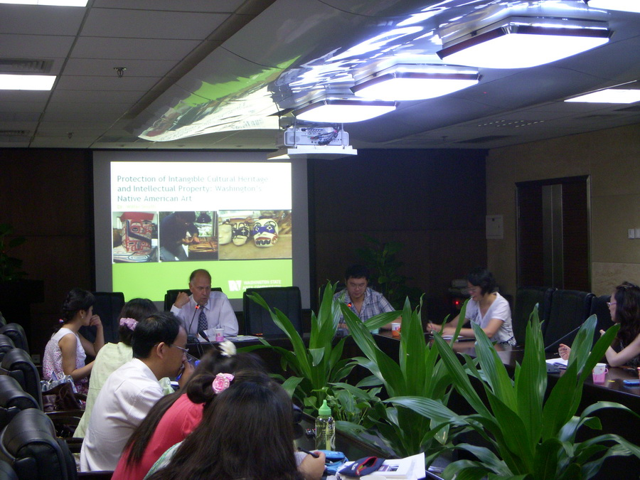 6日上午,史博士讲座的题目是:“非物质文化遗产和知识产权的保护—以华盛顿州的美国印第安人艺术为个案(Protection of Intangible Cultural Heritage and Intellectual Property: The Case of Washington’s Native American Art)”。讲座历时两个半小时,他通过介绍华盛顿州对两种民间工艺的知识产权进行保护的实践分享了美国公共民俗学家对于非物质文化遗产保护的经验。在轻松的气氛中他首先向在场的师生介绍了华盛顿州两种代表性的印第安民间工艺:编筐和木雕。随后他讲到华盛顿州如何通过政府立法对印第安艺术进行保护。“艺术品总是会被模仿的,所以应强调真实再现(本真的印第安文化)的重要性”。他强调,通过对当地艺术家的知识产权进行保护,其实就是对地方民间文化遗产的保护。讲座中介绍的州政府立法中对于文化“本真性”的规定引发了现场激烈的讨论。史博士认真回答了同学们的提问,并与大家就非遗保护的立法和影响等问题进行了深入的交流。现场气氛热烈。主持人杨利慧教授总结了史博士关于华盛顿州保护美国印第安文化遗产的实践经验对现处于非遗文化保护起步阶段的中国的借鉴和启发意义,令同学们受益匪浅。
