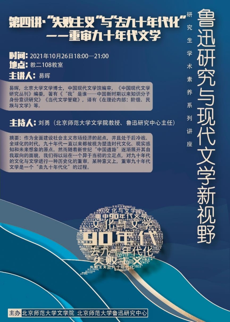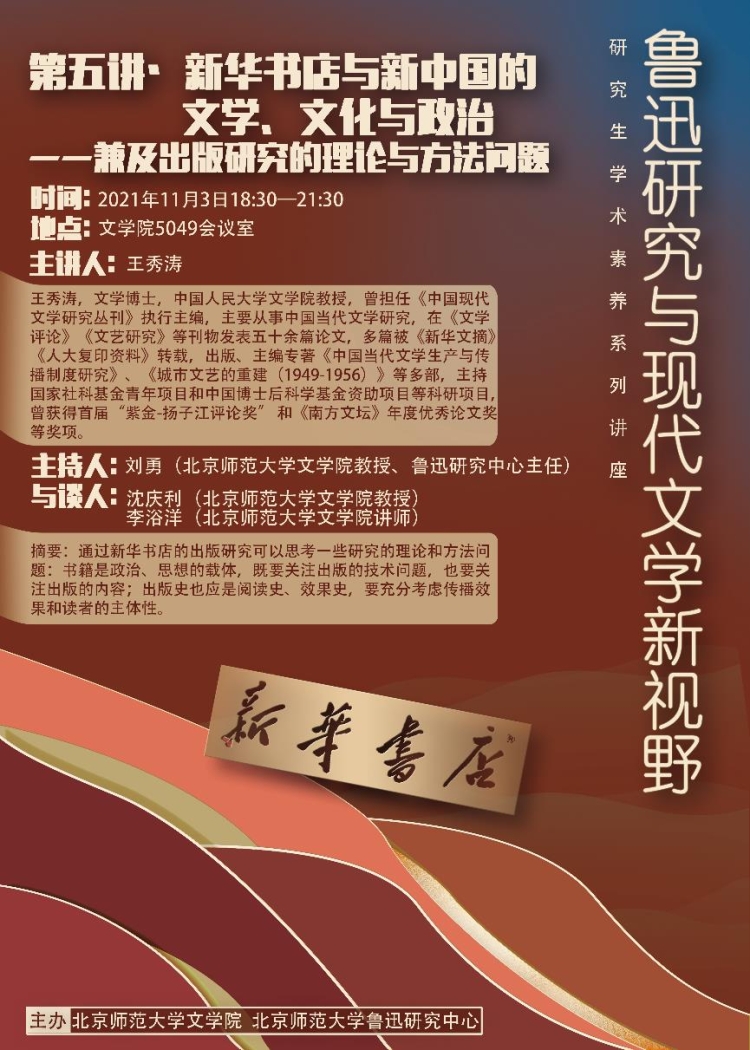 主办单位:yl23455永利 澳门永利鲁迅研究中心 第一讲·怎样理解鲁迅杂文? 时间:2021年10月13日18:30—21:30 地点:yl23455永利5049会议室 主持人:刘勇(澳门永利yl23455永利教授、鲁迅研究中心主任) 与谈人:黄开发(澳门永利yl23455永利教授) 李浴洋(北京师范大学yl23455永利讲师) 摘要:理解鲁迅杂文对于深入理解鲁迅的思想与文学观念都有重要的意义。鲁迅研究中的杂文研究还有很大空间,值得进一步探讨。讲座内容涉及杂文的文体意义、杂文的艺术特征、杂文与鲁迅文学观念的关系,以及鲁迅杂文研究回顾与展望等方面。 主讲人:张洁宇 张洁宇,中国人民大学yl23455永利教授,博士生导师。主要研究方向:鲁迅研究、中国新诗研究。出版有《荒原上的丁香——1930年代北平“前线诗人”诗歌研究》《图本郁达夫传》《独醒者与他的灯——鲁迅<野草>细读与研究》《民国时期新诗论稿》《历史的诗意——中国现代文学与诗学论稿》等专著。 第二讲·如何重新打开文本 ——以鲁迅的《端午节》为尝试 时间:2021年10月13日18:30—21:30 地点:yl23455永利5049会议室 主持人:沈庆利(澳门永利yl23455永利教授) 与谈人:张莉(北京师范大学yl23455永利教授) 陶梦真(北京师范大学yl23455永利讲师) 摘要:经典作家面临着重读的必要和困难。可以尝试从“次级文本”找到突破口。《端午节》是《呐喊》中并不引人瞩目的一篇,但它不仅有复杂的观念,而且同样反映了鲁迅小说的某些内在特质。方玄绰提出的“差不多”说乃是鲁迅人生经验的结晶,是人互为枷锁、互为奴隶、互为傀儡的困境之缩影。在胡适画出了“好人政府”的蓝图、引起舆论关注之际,借助方玄绰“差不多”的口头禅和手中捧读的诗集,鲁迅和风头正劲的胡适开了一个小小玩笑,而在这雅谑背后,更隐伏着“知”/经验型思维与“行”/理念型思维的对立和颉颃。只是这尖锐的思想对话隐伏在琐碎的日常叙事之下,变得难以辨识。因而,从符号和历史两个层面进入文本,可能是一条有效重读经典的路径。 主讲人:孟庆澍 孟庆澍,河南汤阴人,1975年生,首都师范大学yl23455永利教授、博士生导师。主要研究领域为中国近现代文学思潮、现代作家文献整理与研究。先后出版专著《无政府主义与五四新文化——围绕<新青年>同人所作的考察》、《历史·观念·文本——现代中国文学思问录》、《激流中的文本、主义与人》等;在《文学评论》、《文艺研究》等国内外学术期刊发表论文多篇。 第三讲·鲁迅:“创作的短篇小说”的“秘诀” 时间:2021年10月19日18:00—21:00 地点:教二108教室 主持人:刘勇(澳门永利yl23455永利教授、鲁迅研究中心主任) 摘要:鲁迅留学日本的时候用外语读了哪些国外小说?他做过一册由日本人翻译的俄国小说合订本,翻译过很多科幻小说和东欧文学作品,还留下很多阅读回忆……这是一个海量的书目。鲁迅说过自己“创作的短篇小说”的“秘诀”,“大约所仰仗的全在先前看过的百来篇外国作品”,让我们一起遨游于先生留学时代所拣选的故事。 主讲人:姜异新 姜异新,文学博士,北京鲁迅博物馆研究室主任、研究馆员,中国鲁迅研究会副会长。著有《互为方法的启蒙与文学》《走读胡适》《读懂鲁迅》《一代文宗,刹那锦云》《北大红楼——新文化景观》; 编有《民国那些人》《民国那些事》《胡适论教育》《他山之石——鲁迅读过的百来篇外国作品》《<呐喊>导读》《鲁迅致姚克信札》等。发表学术论文近百篇。 第四讲·“失败主义”与“去九十年代化” ——重审九十年代文学 时间:2021年10月26日18:00—21:00 地点:教二108教室 主持人:刘勇(澳门永利yl23455永利教授、鲁迅研究中心主任) 摘要:与八十年代已成为一个终结、异己的时代不同,九十年代一直延续且内化于我们时代。作为全面建设社会主义市场经济的起点,并且处于后冷战、全球化的时代,九十年代一直以来都被视为塑造时代文化、现实感知和未来想象的原点。然而随着新世纪“中国道路”逐渐展开其自我取向的面貌,我们得以站在一个异于当初的立足点,对九十年代的文化与文学进行一种历史化的重审。某种意义上,重审九十年代文学是一个“去九十年代化”的过程。 主讲人:易晖 易晖,北京大学文学博士,中国现代文学馆编审,《中国现代文学研究丛刊》编委,著有《“我”是谁——中国新时期以来知识分子身份意识研究》《当代文学管窥》,译有《在理论内部:阶级、民族与文学》等。 第五讲·新华书店与新中国的文学、文化与政治 ——兼及出版研究的理论与方法问题 时间:2021年11月3日18:30—21:30 地点:yl23455永利5049会议室 主持人:刘勇(澳门永利yl23455永利教授、鲁迅研究中心主任) 与谈人:沈庆利(北京师范大学yl23455永利教授) 李浴洋(yl23455永利讲师) 摘要:新华书店是中国共产党在延安建立的出版发行机构,在中共的文艺和文化工作中发挥了重要作用,新中国成立前后,新华书店被集中统一起来为新政权服务:通过出版政策性和文艺书籍为政治共同体的塑造服务;通过特定类型的书籍出版塑造新的阶级主体;通过各种形式的发行途径使得新的政治文化充分传播。通过新书书店的出版研究可以思考一些研究的理论和方法问题:书籍是政治、思想的载体,既要关注出版的技术问题,也要关注出版的内容;出版史也应是阅读史、效果史,要充分考虑传播效果